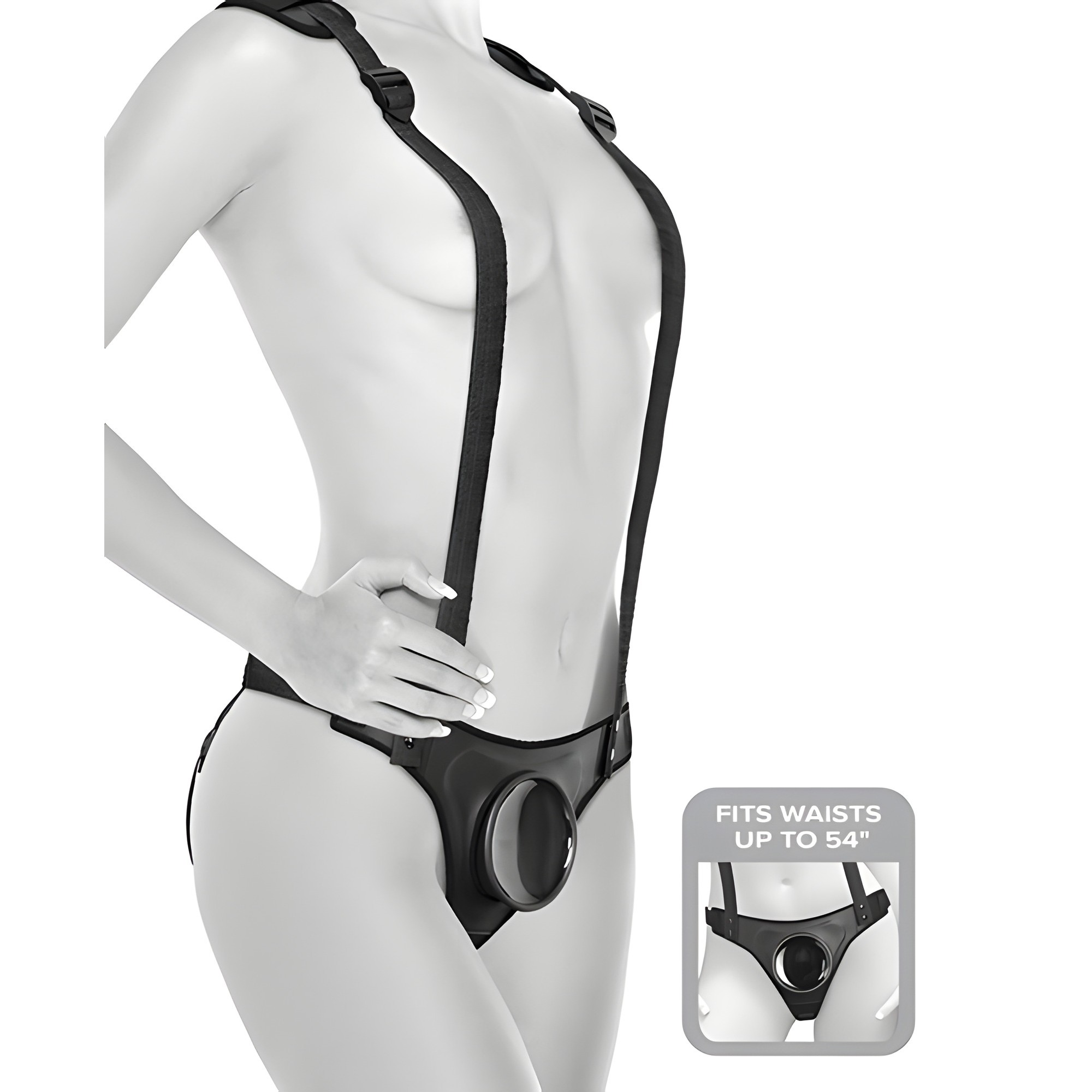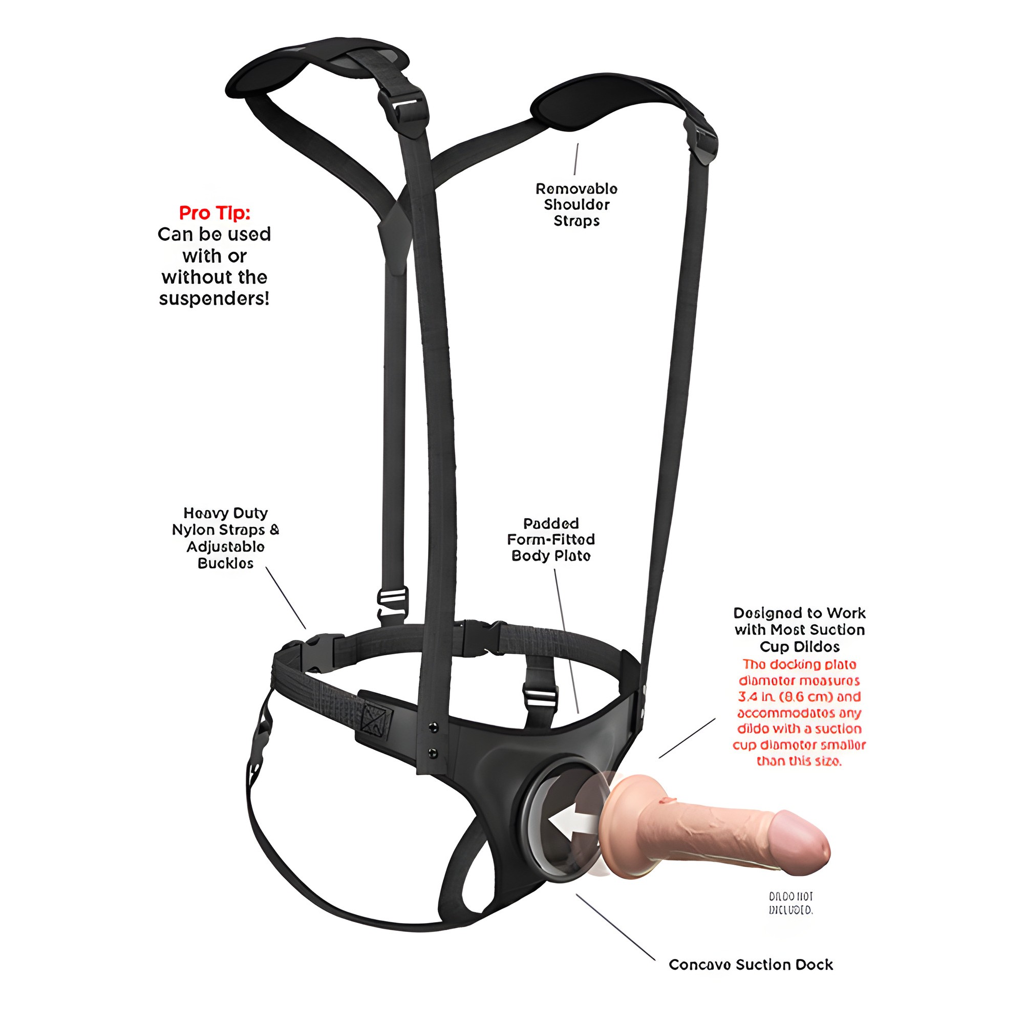 Designed for easy use, these suspenders accommodate any dildo with a suction cup diameter of 3.4 inches or smaller.