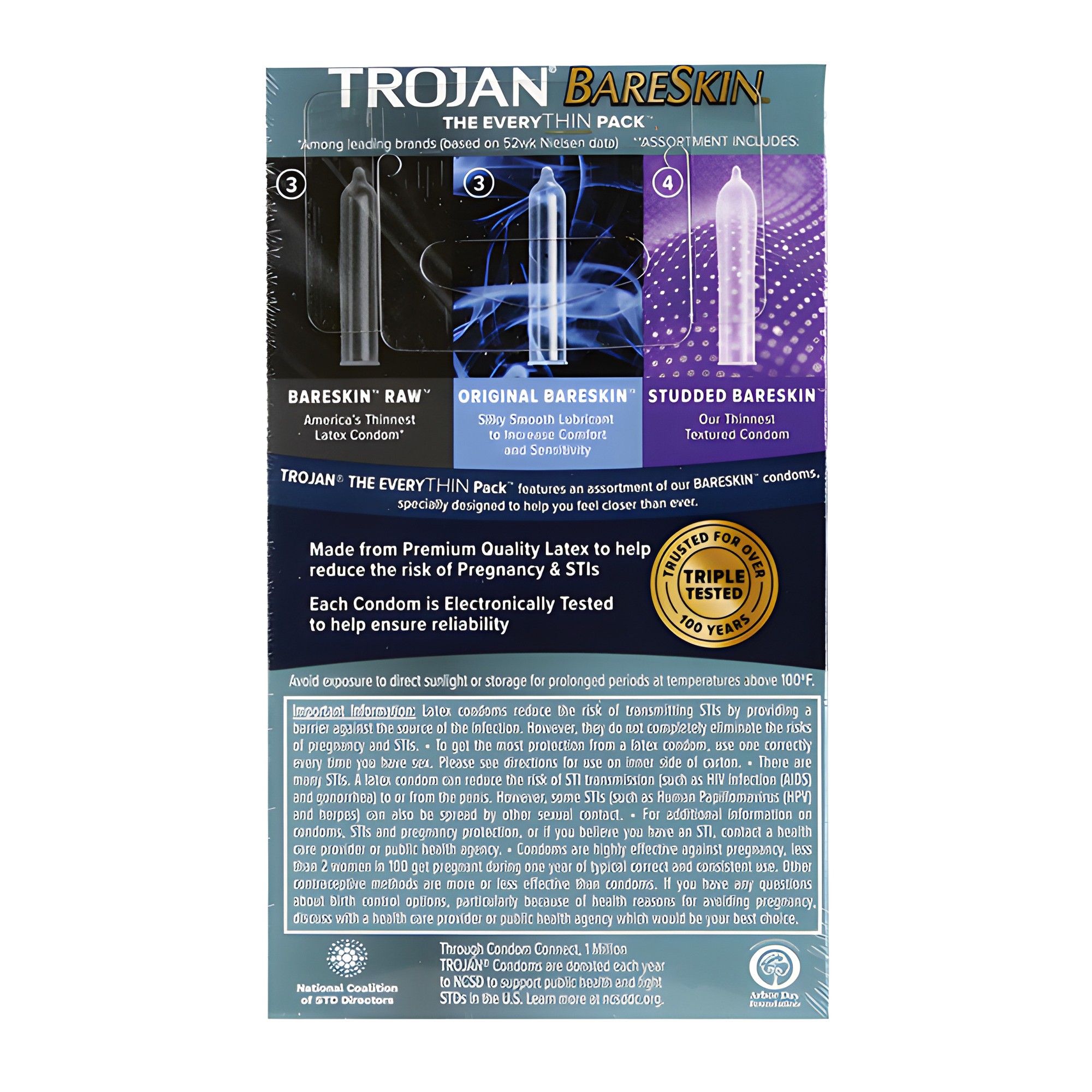 Explora los condones más delgados que Trojan ofrece con el paquete variado BareSkin EveryTHIN, que presenta opciones originales, crudas y con protuberancias.